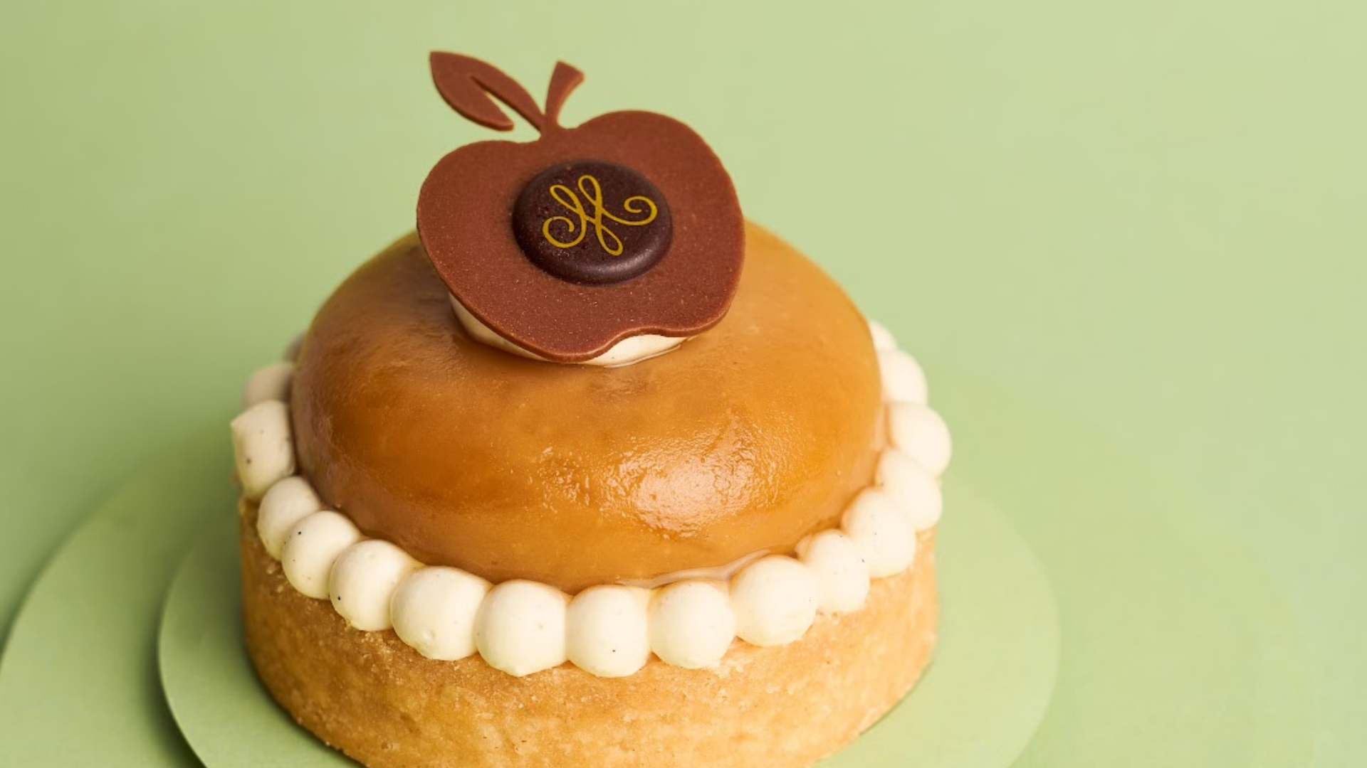 Pâte sucrée amandes et noisettes garnie d'une fine couche de frangipane, caramel onctueux à la vanille, ganache montée à la vanille de Madagascar, palet de pommes façon tatin en deux textures.